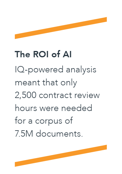 The ROI of AI IQ-powered analysis meant that only 2,500 contract review hours were needed for a corpus of 7.5M documents.